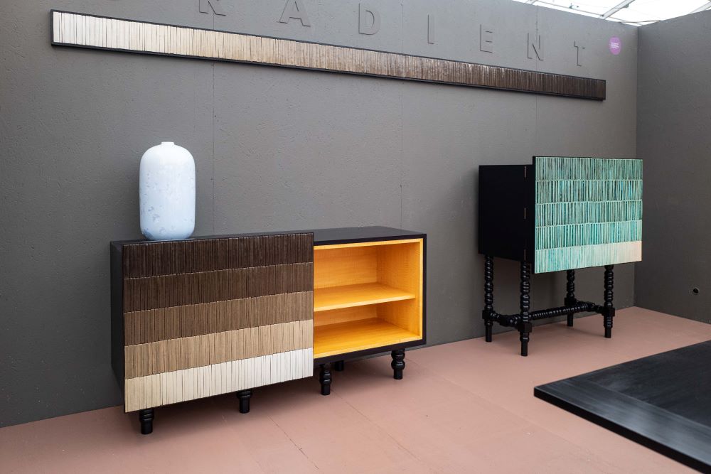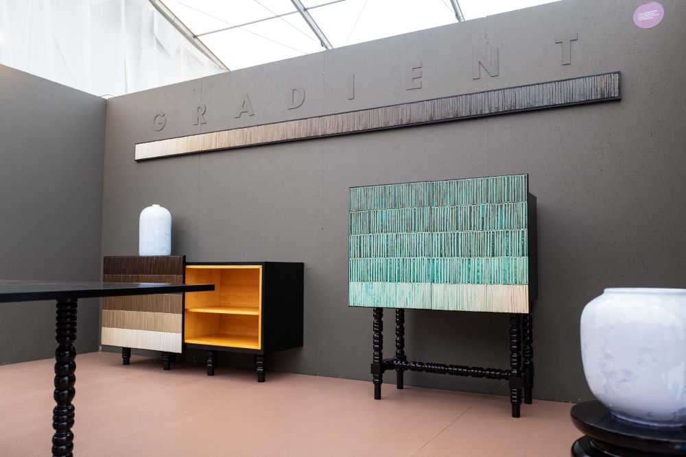 The gradient is an original furniture collection combining exotic wood and ceramic mosaic, developed in cooperation between the designers Jakub Vávra and Milan Pekař.The cabinet is hand crafted out of beech wood and combination of beech and eucalyptus veneer. Ceramic tiles are hand press and glazed with 80 glazes with different amount of copper oxide.